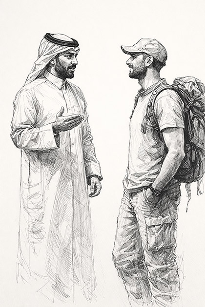 Celebrate the beauty of human connection across cultures with this expressive hand-drawn pencil sketch featuring an Arab man in traditional attire engaged in conversation with a modern traveler. This artwork captures a meaningful moment of dialogue, respect, and shared understanding—making it a powerful addition to any living space, office, or gallery wall.