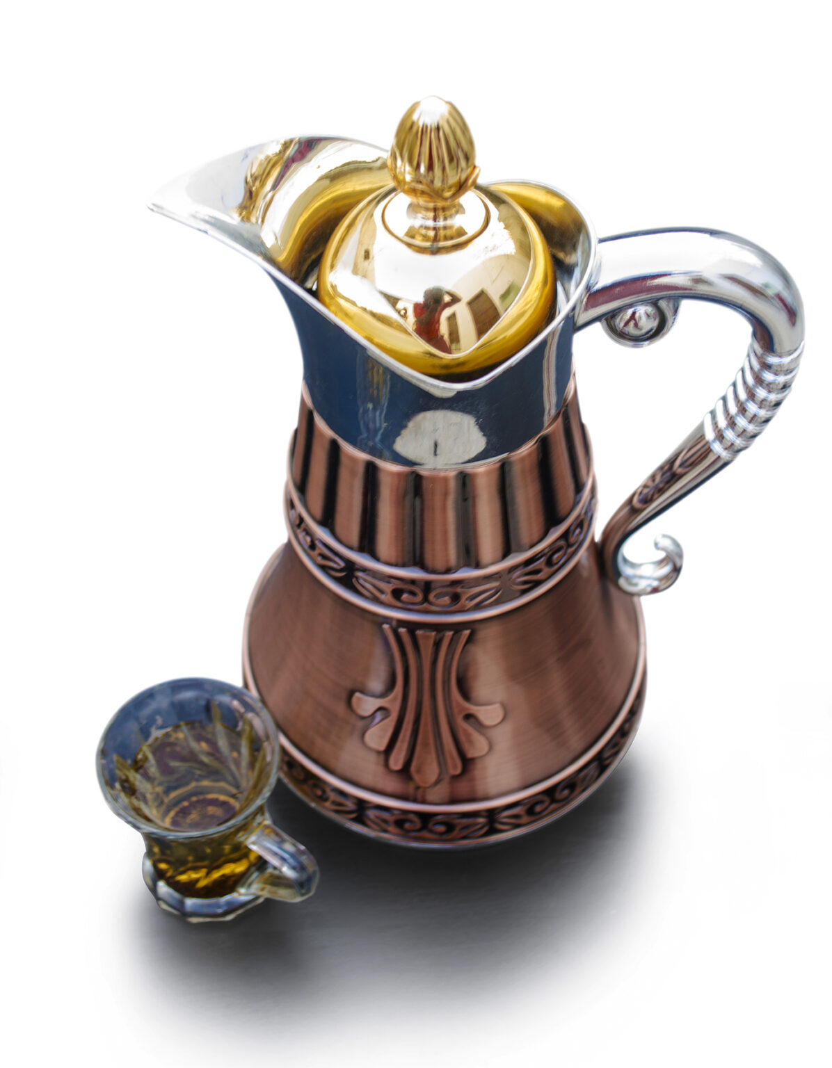 The coffee is poured from a distinctive traditional pot called a dallah, an iconic symbol of Bedouin and Gulf heritage. The dallah’s elegant, long-spouted design not only serves a practical purpose but also embodies craftsmanship and cultural identity passed down through generations.