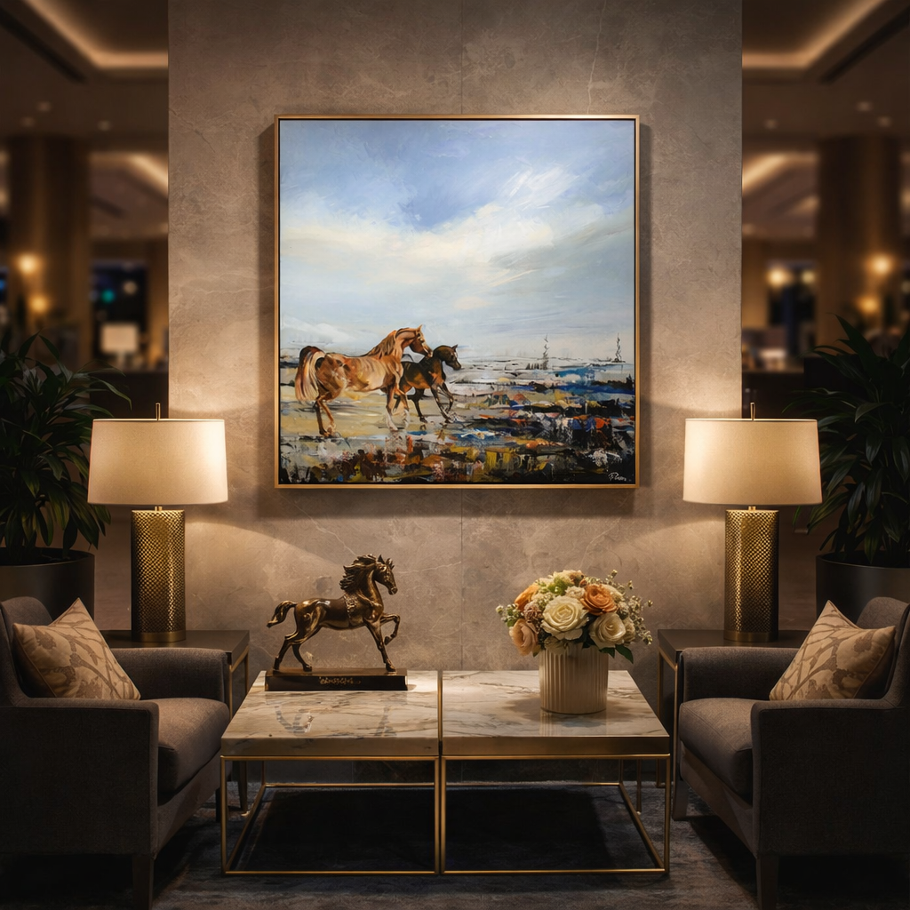 In summary, Arabian Grace is more than just a painting—it is a tribute to elegance, heritage, and the free spirit of the Arabian horse. With its abstract design, balanced composition, and symbolic resonance, this piece elevates any room into a space of calm reflection and refined beauty.