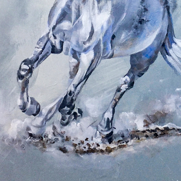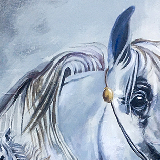 Arabian Horse Majesty, the breathtaking acrylic painting, captures the grace and power of the Arabian horse in a striking blend of realism and artistic expression. The composition features a majestic white Arabian horse, its head held high, exuding elegance and nobility, while a spirited young foal gallops freely, symbolizing vitality and freedom. The ethereal, misty background enhances the dreamlike quality of the piece, adding depth and movement to the scene. With exquisite attention to detail, the artist brings out the essence of these magnificent creatures, making this artwork a perfect addition to any equestrian lover’s collection.