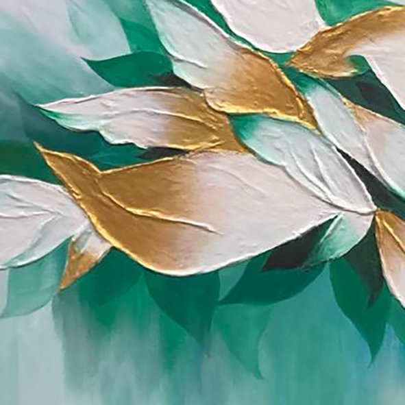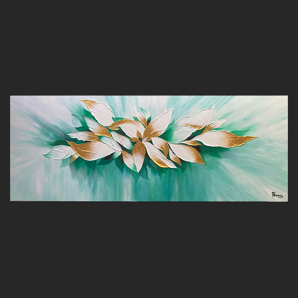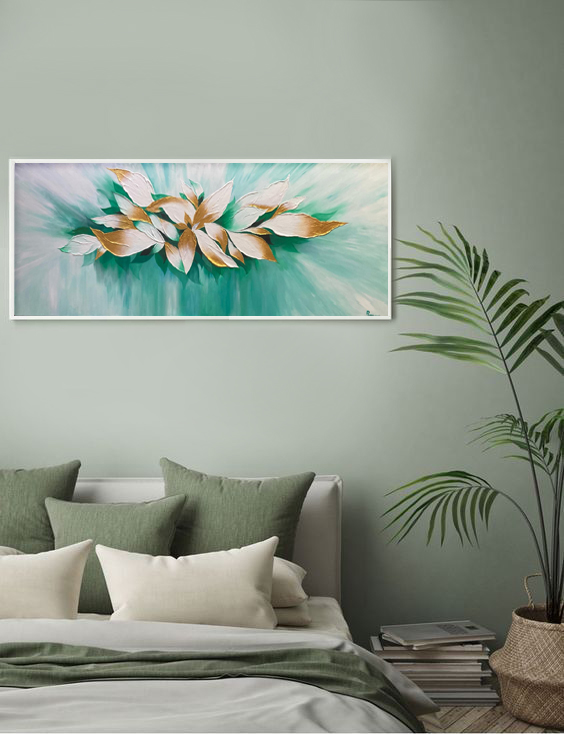 Ethereal Bloom F003, A mesmerizing fusion of elegance and tranquility, captures nature’s delicate beauty in a contemporary style. The artwork features a cluster of gracefully unfolding leaves, their tips kissed with radiant gold, exuding an air of sophistication and serenity. The dynamic green backdrop blends seamlessly into soft white, creating a sense of movement and depth as if the leaves are floating in a gentle breeze. This captivating piece embodies harmony, making it a perfect statement for modern interiors seeking a touch of nature’s grace and refinement.