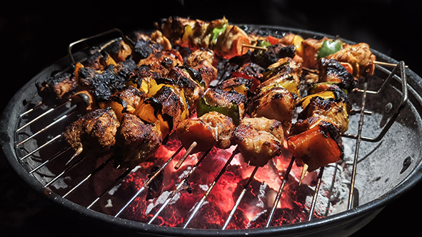 Complementing the chicken is a carefully arranged medley of grilled vegetables. Bright red tomatoes blister gently under the heat, sliced potatoes develop crisp edges with soft centers, and vibrant bell peppers release their natural sweetness as they char. Scattered pepper seeds and coarse salt crystals enhance the realism, highlighting the raw, honest beauty of traditional barbecue preparation. Wisps of smoke rise softly through the frame, adding depth and atmosphere while enhancing the artwork’s sensory impact.