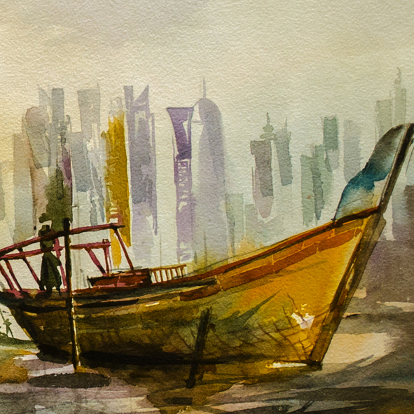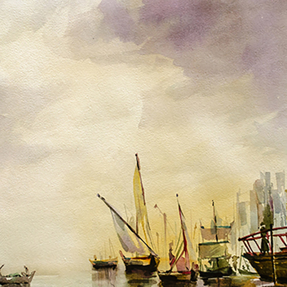 Dawn at Dhow Moor captures the quiet elegance and enduring legacy of traditional dhows, vessels that have sailed the Arabian seas for centuries. The painting celebrates not only the craftsmanship and cultural significance of these iconic boats but also the serene environment in which they rest, evoking a sense of reflection, calm, and nostalgia.