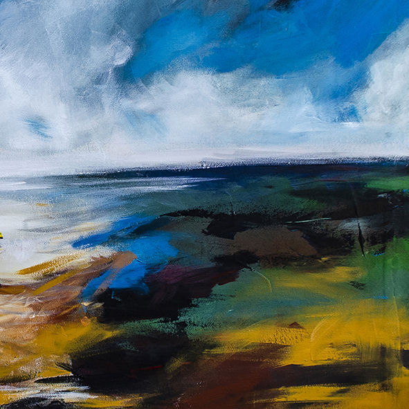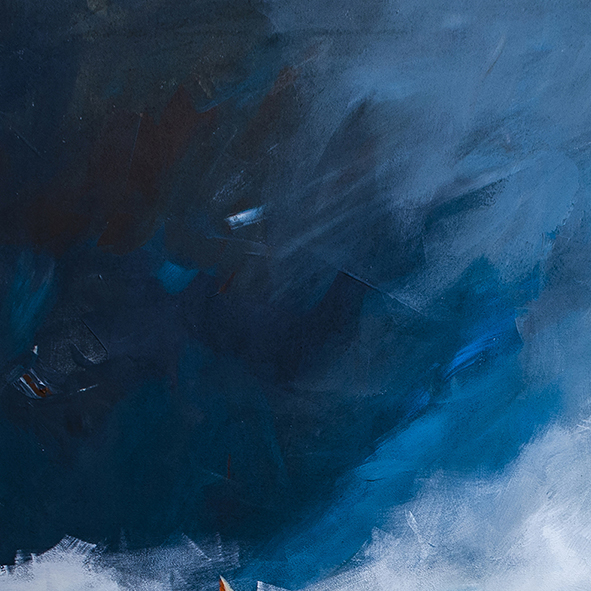 Dreams Afloat, an abstract landscape painting, captures the mystical presence of a moored dhow resting beneath a fantasy sky. The surreal hues of the heavens blend seamlessly with the shifting tones of the water, creating an otherworldly atmosphere. The dhow, anchored yet seemingly adrift in a sea of dreams, symbolizes both stillness and the promise of unseen journeys. The fluid forms and ethereal colors evoke a sense of wonder, inviting the viewer to drift into a world where sky and sea merge in an endless dance of imagination.