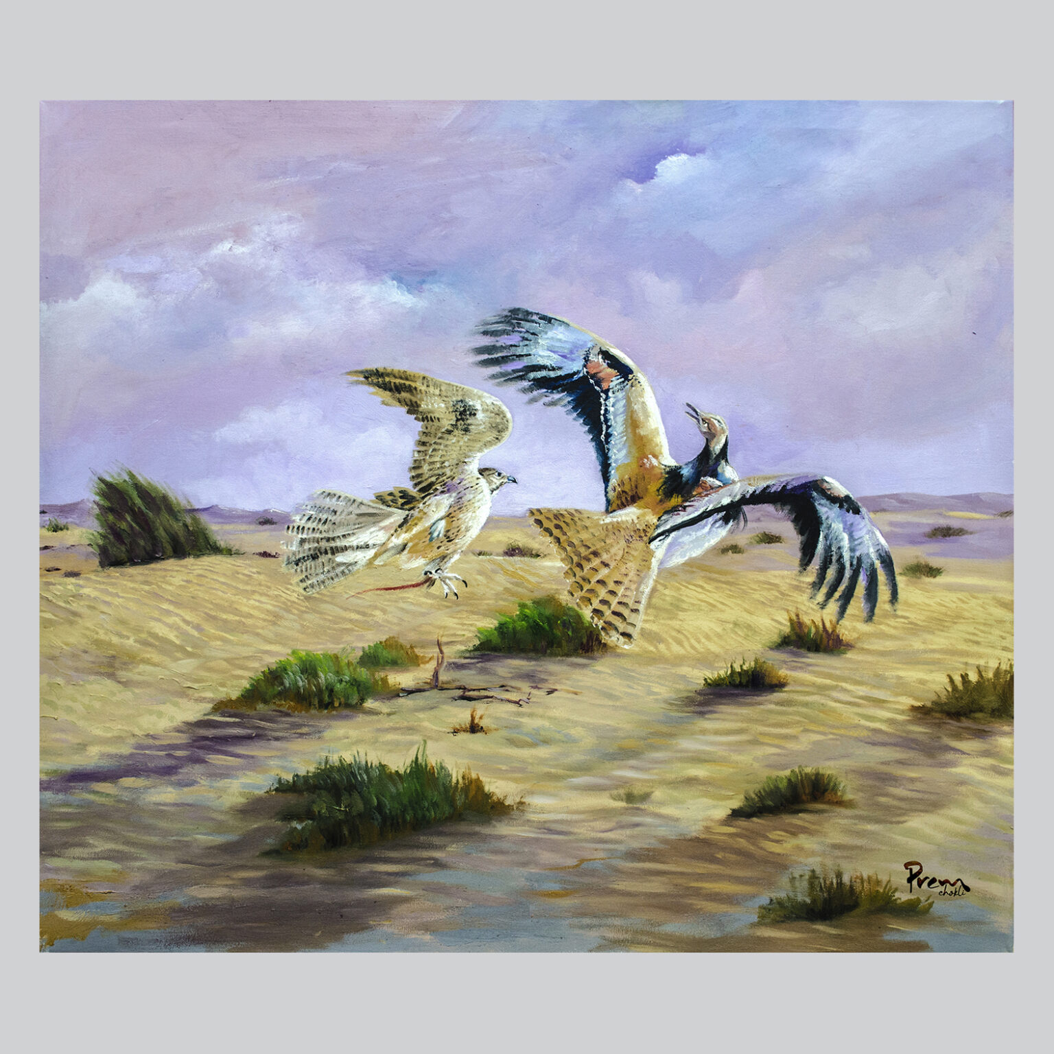 Designed with rich textures and carefully balanced colors, this digital painting reflects the artistry of traditional fine art while embracing the versatility of modern digital techniques. The warm tones of the desert landscape contrast beautifully with the soft hues of the sky, while the detailed rendering of the falcons brings life and realism to the composition. Every brushstroke and tonal transition has been crafted to enhance visual impact, making this artwork suitable for both contemporary and classic interior spaces.