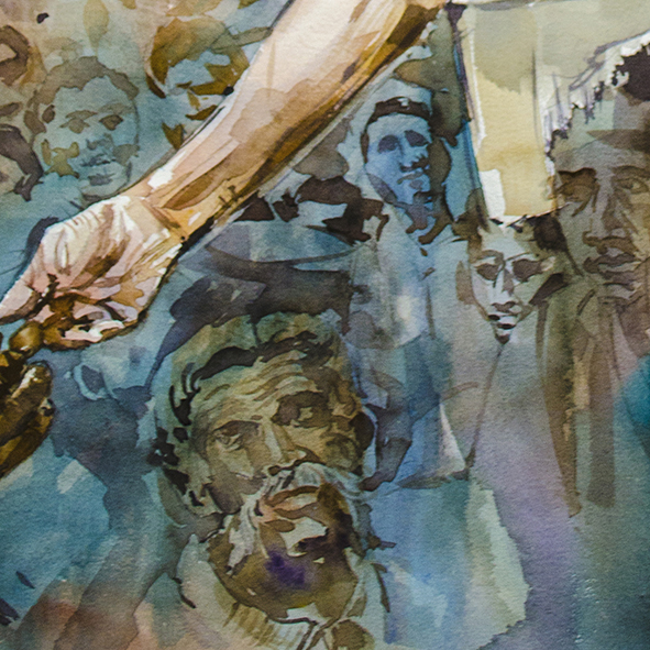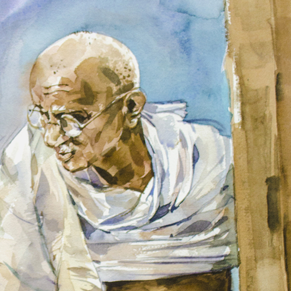 Gandhi’s Vision – Chennai, 1946. This evocative watercolor painting captures Mahatma Gandhi at the Constructive Workers’ Conference in Chennai, January 1946. With a raised hand and an expression of deep contemplation, the artwork conveys his unwavering commitment to nonviolence, unity, and social reform. The fluid brushstrokes and soft color palette reflect the simplicity and spiritual strength of the leader, making this piece a powerful tribute to his enduring legacy.