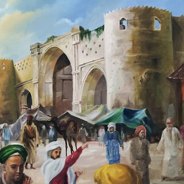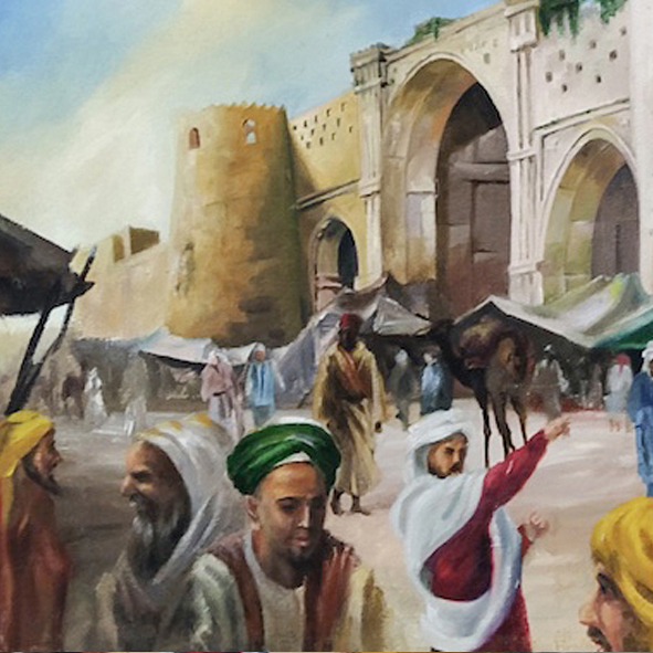 This stunning oil painting, Gateway to the Past – Macca Gate, 1856, transports viewers to a historic moment in Jeddah’s rich past. Capturing the grandeur of the Macca Gate before the demolition of Jeddah’s old walls, the artist masterfully renders intricate architectural details and the vibrant marketplace of the era. The composition immerses us in the daily life of 19th-century Jeddah, where traders, travelers, and locals gather under the imposing structure. The warm, earthy tones and textured brushstrokes bring a sense of depth and nostalgia, making this framed masterpiece a timeless tribute to the city’s cultural heritage.