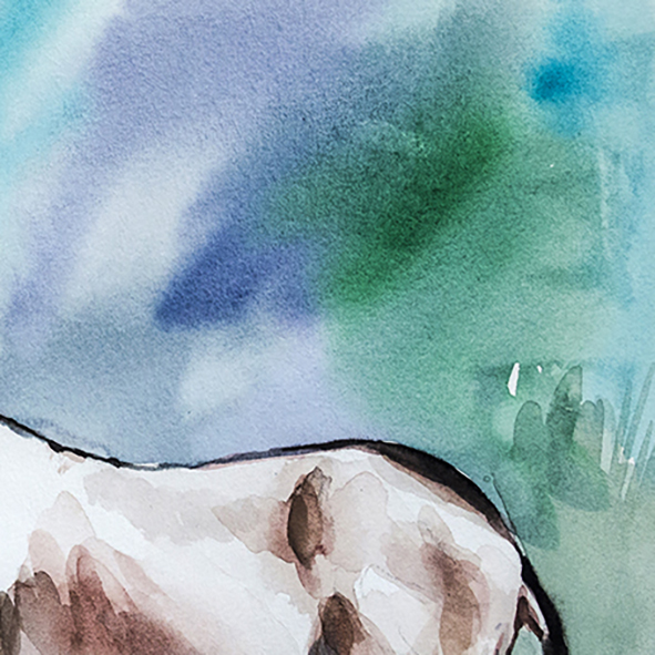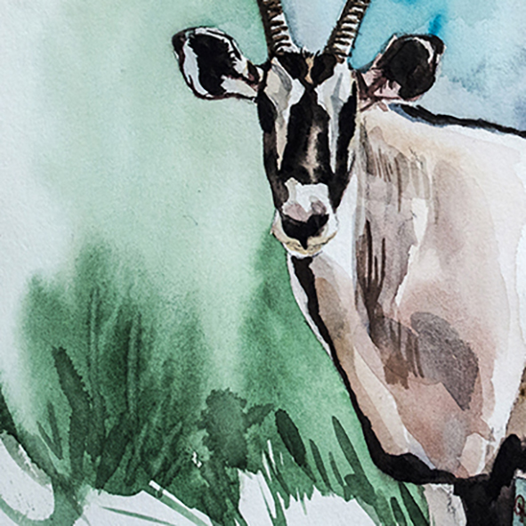 A striking watercolor painting of the Arabian Oryx, brought to life with stylish, dynamic strokes that convey both power and elegance. The artist’s detailed approach captures the distinctive features of the Oryx—its strong horns, graceful posture, and desert beauty—while the fluid brushstrokes evoke the vast, sweeping dunes of its natural habitat. A sophisticated blend of realism and artistry, this piece celebrates the noble spirit of the Arabian Oryx.