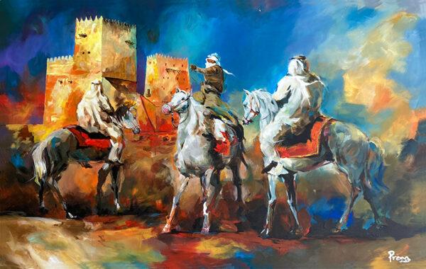 Step into a world where history meets spirit with “Guardians of Heritage ”, a powerful abstract painting that evokes the noble presence of Arabian horsemen standing proudly before the historic Barzan Fort. This canvas work from Prem Art Gallery blends cultural pride, architectural legacy, and dynamic movement to create a deeply resonant piece of wall art.
