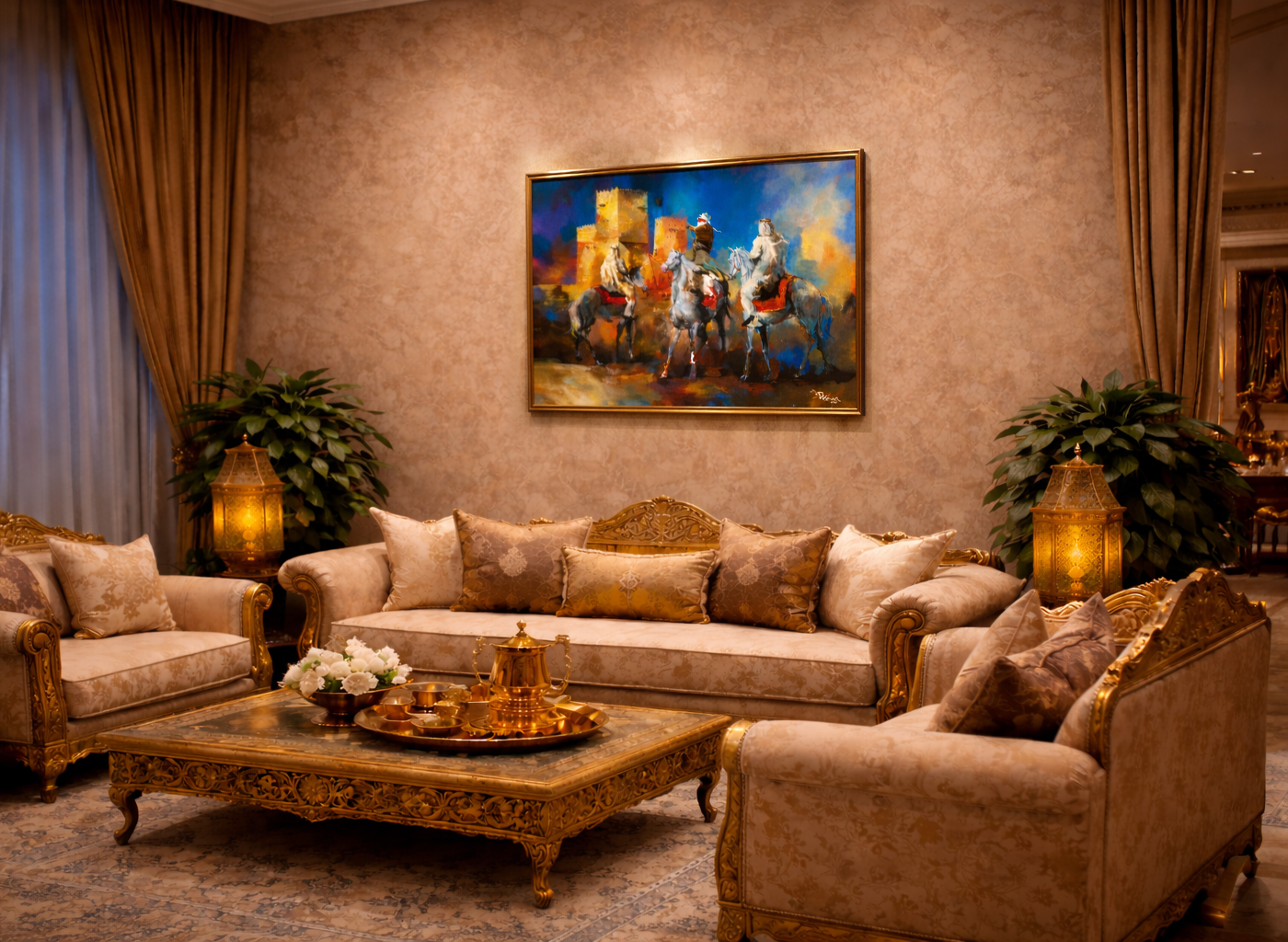 Experience the spirit of Arabian heritage with Guardians of Heritage — a luxury canvas painting featuring traditional horse riders. Perfect statement wall art for elegant living rooms, majlis interiors, and contemporary spaces.