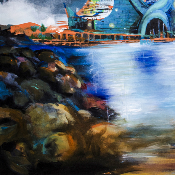 In this painting, the twin arching Katara Towers rise gracefully from the shoreline, their distinctive crescent-shaped forms echoing Qatar’s national seal. Wikipedia+2Middle East Architect+2 The architecture is both futuristic and deeply rooted in heritage, blending tradition and innovation in one dramatic visual. The towers’ mirrored image on calm water creates a serene symmetry that draws the viewer into a contemplative dialogue with the structure — and with the city’s ambitious spirit.