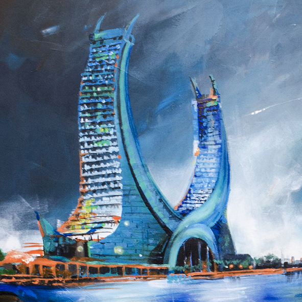 Beyond its visual appeal, “Reflections of Lusail” carries rich symbolic meaning. The Katara Towers are more than just skyscrapers — they are a modern emblem of Qatari identity, inspired by traditional crossed scimitar swords. Middle East Architect. Their design symbolizes strength, unity, and a bold vision for the future, attributes that are beautifully echoed in the painting’s reflective composition.