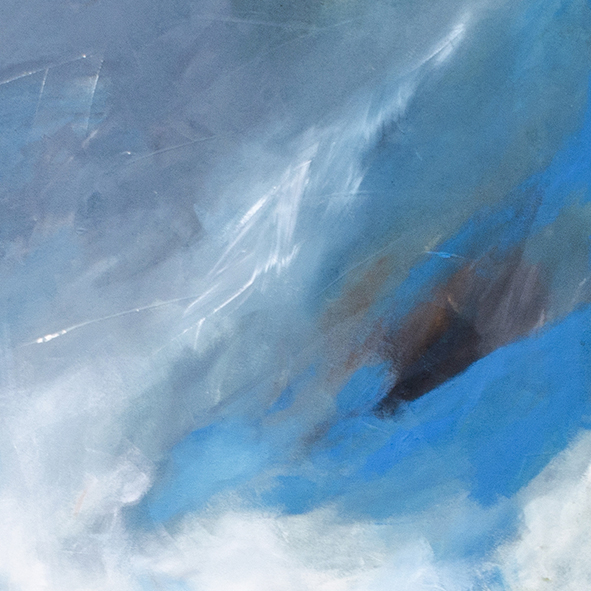 The color palette of the painting is thoughtfully composed: soft blues and muted grays of the sky transition into the glassy reflections on the water, while pale golden hues on the towers hint at the warm glow of sunlight or internal lighting. This harmony of tones amplifies the sense of balance, calm, and sophistication, making the artwork a perfect fit for refined, contemporary interiors.