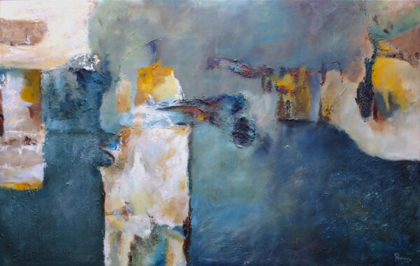 In this painting, ancient shelters and primitive structures are reimagined through abstract forms rather than literal depictions. The artist uses expressive brushwork and layered textures to hint at the outlines of caves and early settlements, evoking an emotional connection to the places our ancestors once inhabited. There’s a sense of mystery and depth in the shapes — as though the primitive shelters are emerging from the canvas in amorphous, symbolic forms.