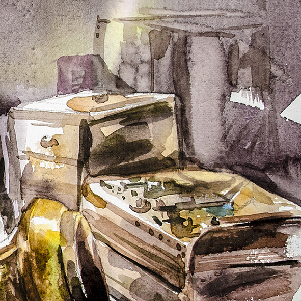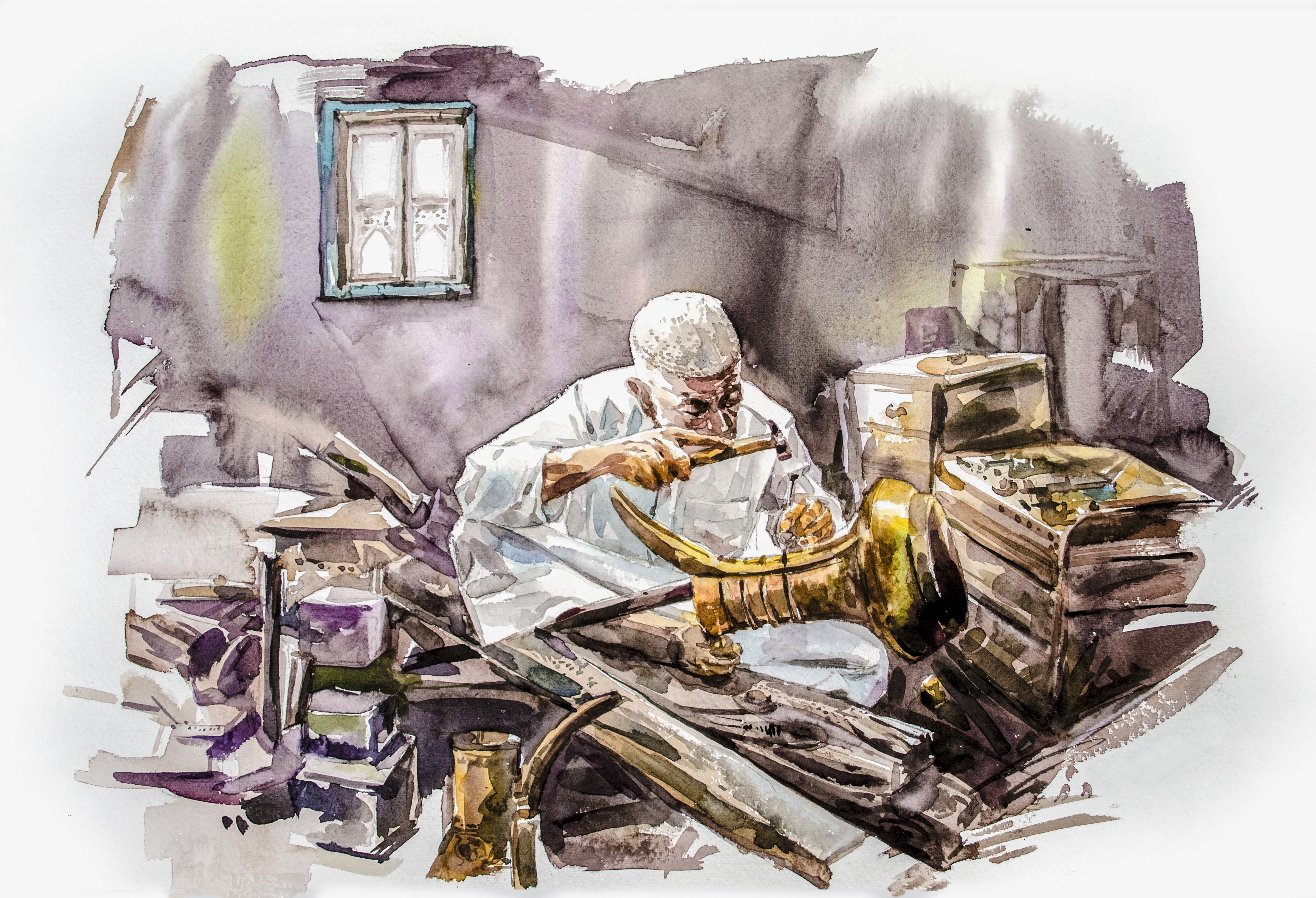 “The Dallah Maker” pays tribute to one of the most symbolic elements of Arabian culture: the traditional dallah coffee pot. The artwork portrays a master craftsman at work—an artisan deeply connected to his legacy, shaping each curve with precision and devotion. The scene reflects not just the making of a vessel but the preservation of a cultural tradition passed down through generations.