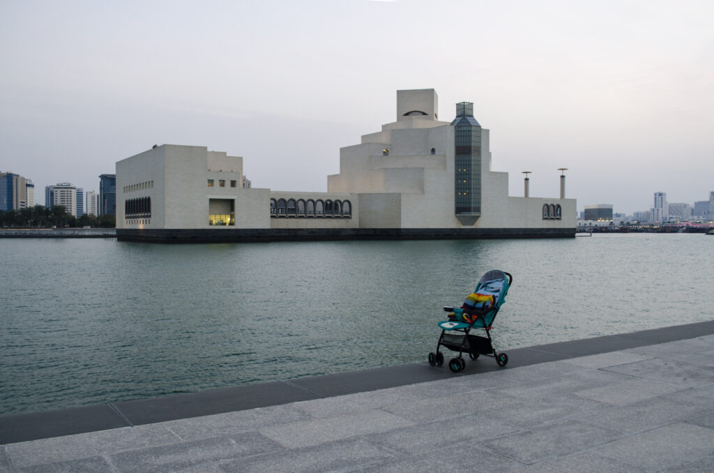 The image of the Museum of Islamic Art, Doha, Qatar, captured here also subtly conveys the museum’s relationship with its surroundings — perched on a man-made peninsula that extends into Doha Bay, offering panoramic views of the shimmering water and the adjacent skyline. This setting not only enhances the Museum’s visual impact but also reinforces its role as a cultural beacon on Qatar’s waterfront.