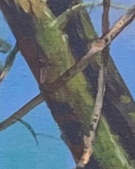 Using high-quality acrylics, the artist has employed various techniques to create a tactile experience. You can see the confidence in every stroke—from the thin, spindly lines of the reaching branches to the thick, impasto-like applications that give the tree trunks their rugged, weathered appearance. The reflection of the leaning branch in the still water is particularly striking, rendered with a delicate touch that evokes a sense of profound stillness and peace.