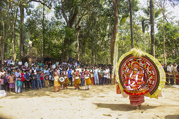As the ritual progresses, the performer enters the stage wearing the elaborate costume and gradually transitions into a trance-like state. Devotees believe that at this moment, the goddess Chamundi enters the body of the performer. Once possessed, the Theyyam becomes a living deity, offering blessings, advice, and protection to the community. People gather around to seek guidance, healing, and spiritual reassurance from the goddess.