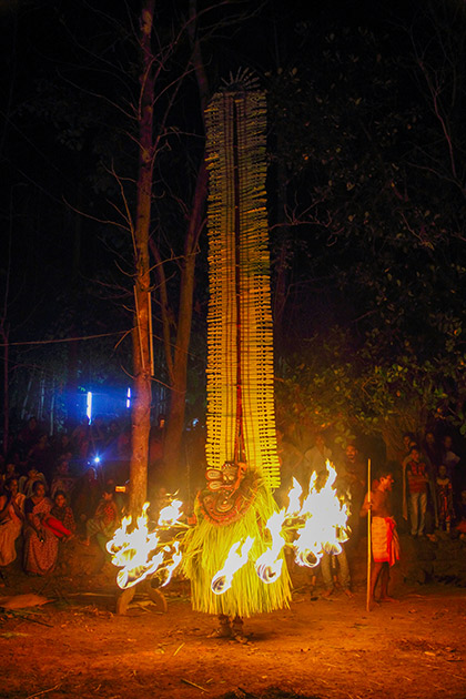 Theyyam performances usually begin with the rhythmic sounds of traditional instruments such as the chenda, elathalam, and kuzhal. The intense drumming gradually builds a sacred atmosphere that prepares the space for the ritual transformation. Through energetic movements, symbolic gestures, and chanting, the performer enters a trance-like state believed to mark the arrival of the divine spirit. This moment is considered the spiritual peak of the ceremony.