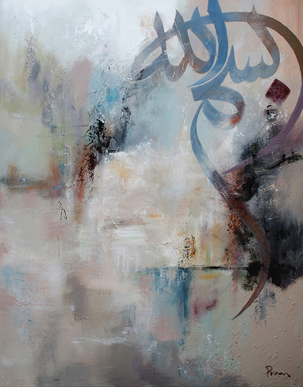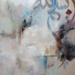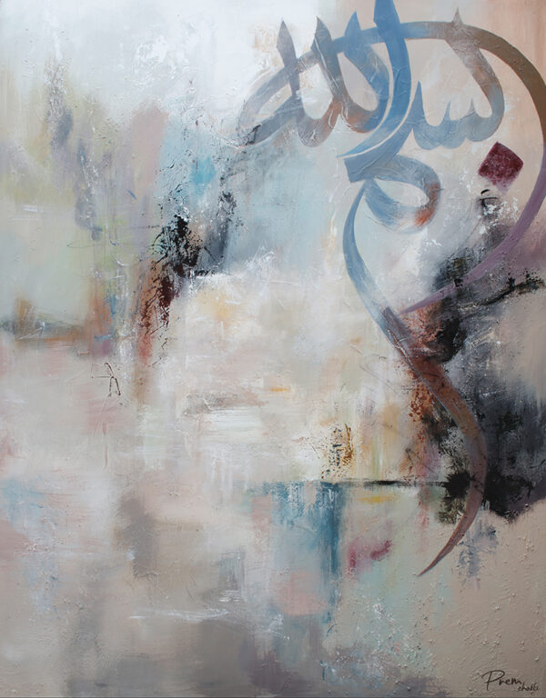 Crafted with meticulous attention to detail, the painting features intricate Arabic script that flows gracefully across a richly textured background. The artist’s use of layered textures and subtle tonal variations creates a dynamic contrast between the smooth, flowing letters and the raw, expressive canvas surface. This combination highlights the harmony between the sacred and the contemporary, capturing the essence of Islamic art in a modern form.