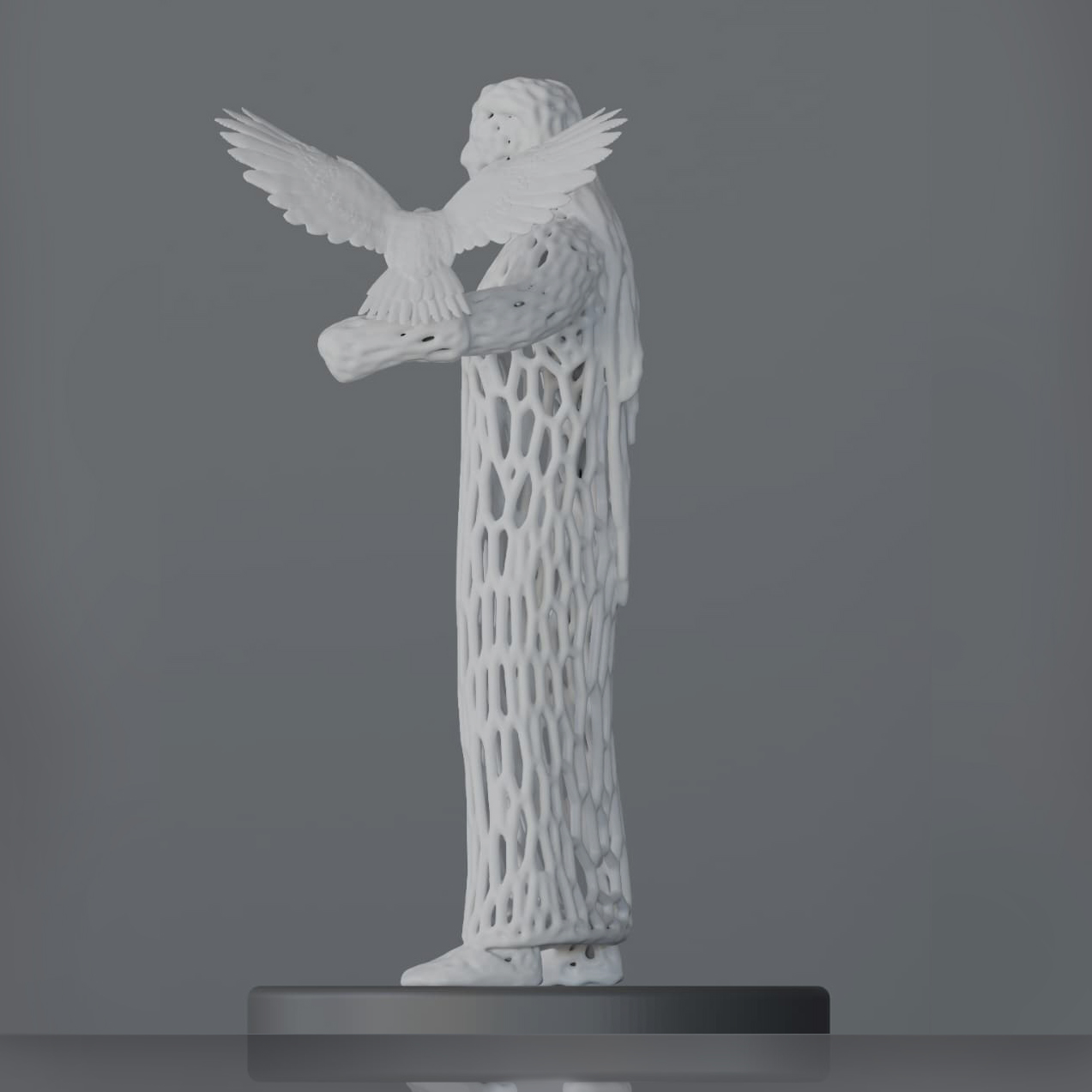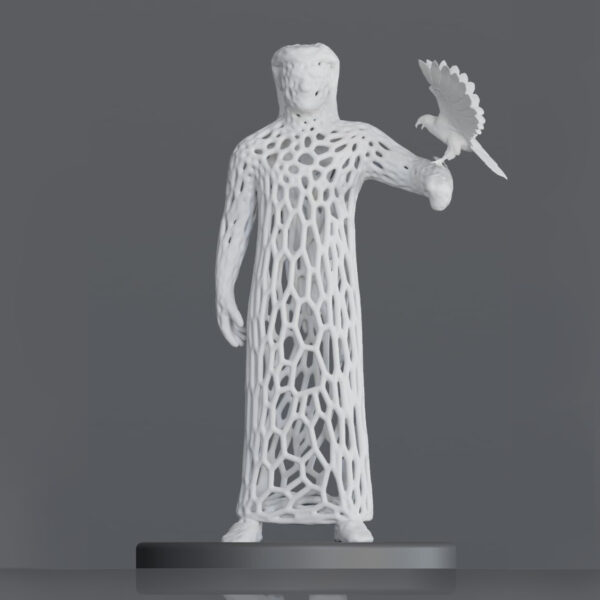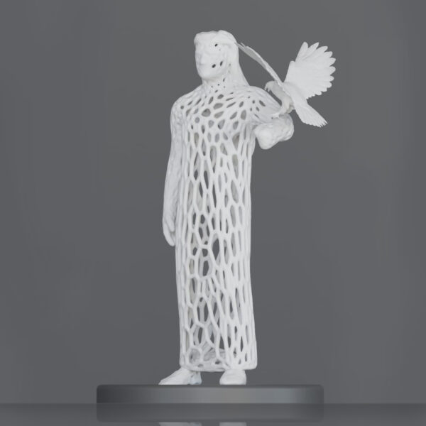 An elegant lattice-form figure stands tall, a falcon perched gracefully on their arm. This sculpture embodies heritage, strength, and the enduring spirit of freedom carried on the wings of tradition.