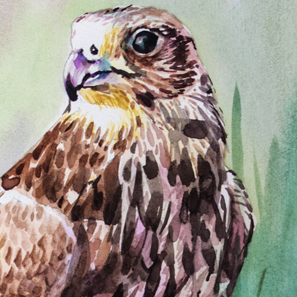 The painting features rich, natural tones that echo the falcon’s environment—earthy browns, deep greys, sandy hues, and striking dark accents. These shades create beautiful contrast and enhance the artwork’s realism, allowing the falcon’s form to stand out boldly against the background.
