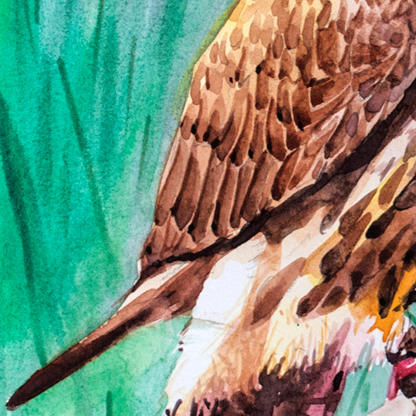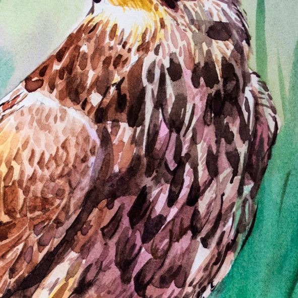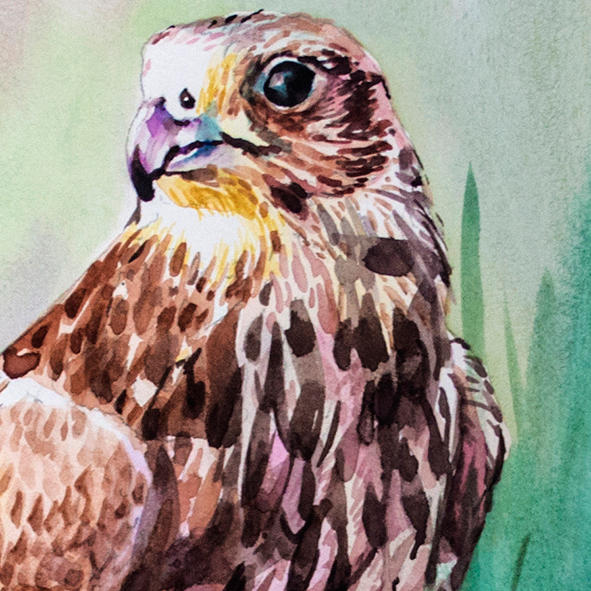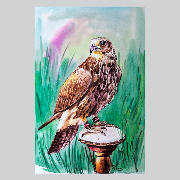 This exquisite watercolor painting captures the falcon in breathtaking detail, showcasing its piercing gaze, intricate feather patterns, and poised strength. The fluidity of watercolor enhances the realism, bringing to life the bird’s grace and power. A tribute to one of nature’s most skilled hunters, this artwork embodies precision, agility, and majesty.